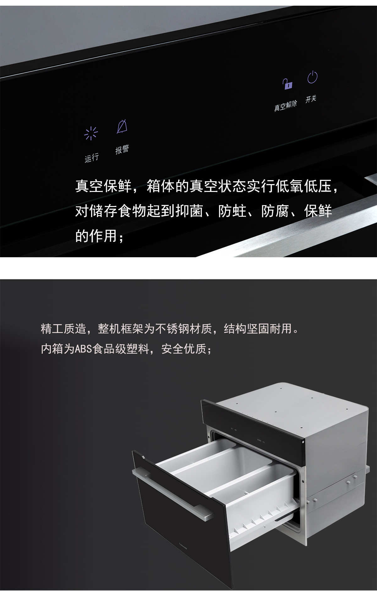 黑色鋼化玻璃面板;低氧低壓,真空保鮮;內(nèi)箱為ABS食品級塑料;