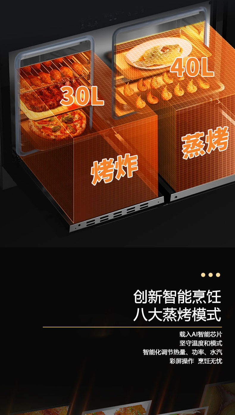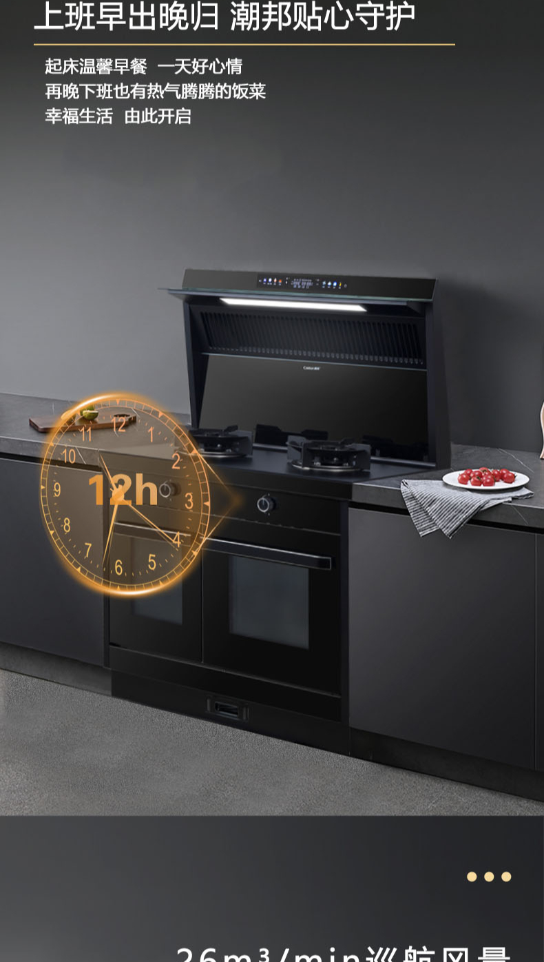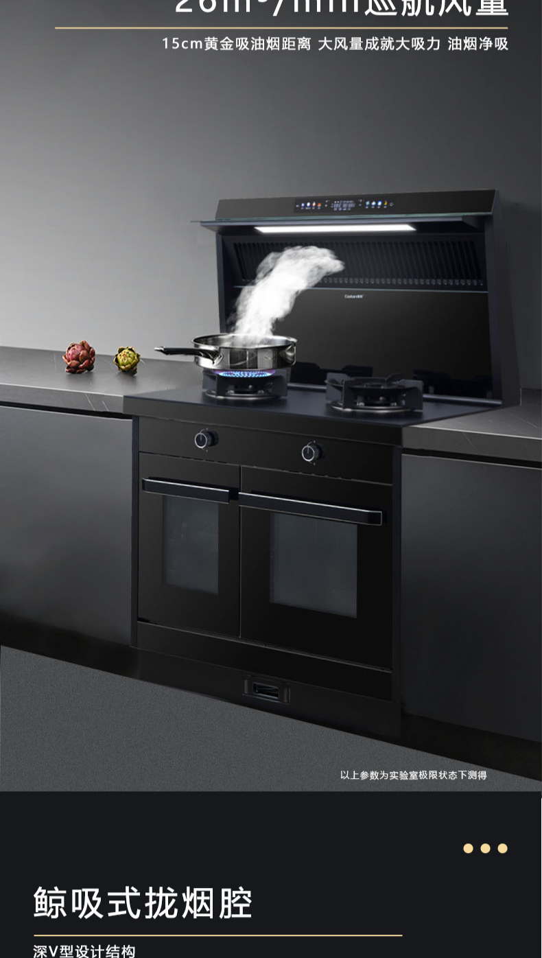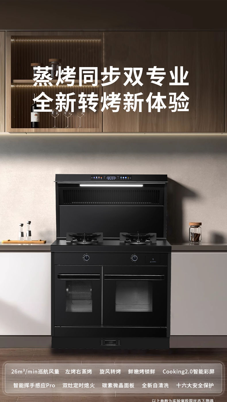 26m3每分巡航風(fēng)量,左烤右蒸烤,旋風(fēng)轉(zhuǎn)烤,智能彩屏,揮手感應(yīng),雙灶定時(shí)熄火